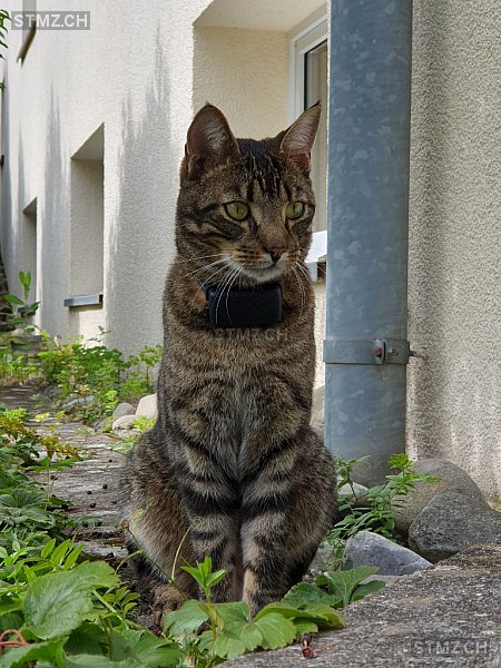 Er hat ein Herzchen vorne auf der Brust. Ist eher scheu gegenüber Menschen. Sein Revier ist sehr gross (Oberrieden). Er trägt ein rotes Halsband.