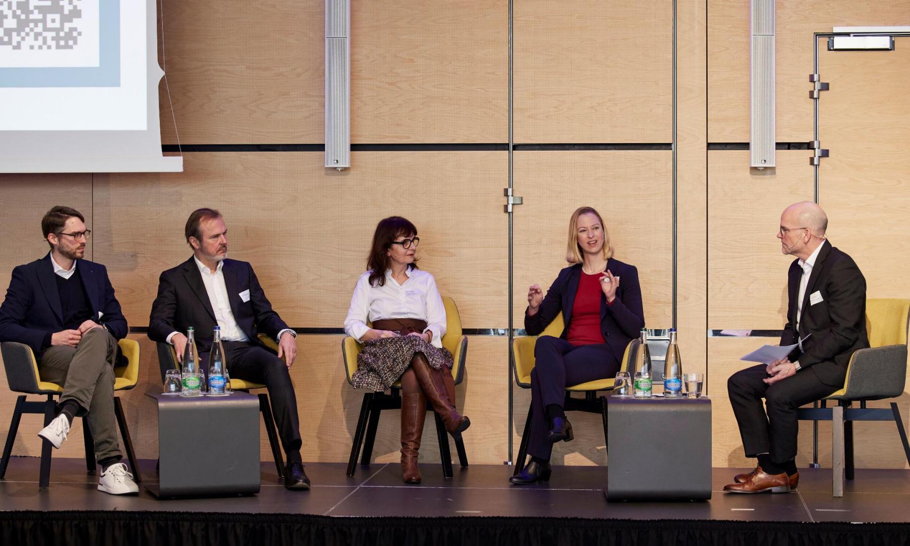 Eine abschliessende Paneldiskussion mit Milan Prenosil, Verwaltungsratspräsident Confiserie Sprüngli AG, Veronica Weisser, Head UBS Vorsorge Innovation Hub, Amalia Zurkirchen, Geschäftsführerin Kaufmännischer Verband Zürich, und Manuel Buchmann, Projektmanager «Demografik» und Autor, griff den Appell der Regierungsrätin auf und widmete sich der Problematik Arbeitskräftemangel durch die demografische Entwicklung. Die Arbeitsmarktschere wird sich in den nächsten Jahren weiter öffnen und die Zürcher Wirtschaft vor Herausforderungen stellen. Die Panelteilnehmenden diskutierten die Lösungswege, die Regierungsrätin Walker Späh vorschlug, und erörterten weitere mögliche Massnahmen, um dem Arbeitskräftemangel entgegenzuwirken und künftiges Wirtschaftswachstum zu sichern.