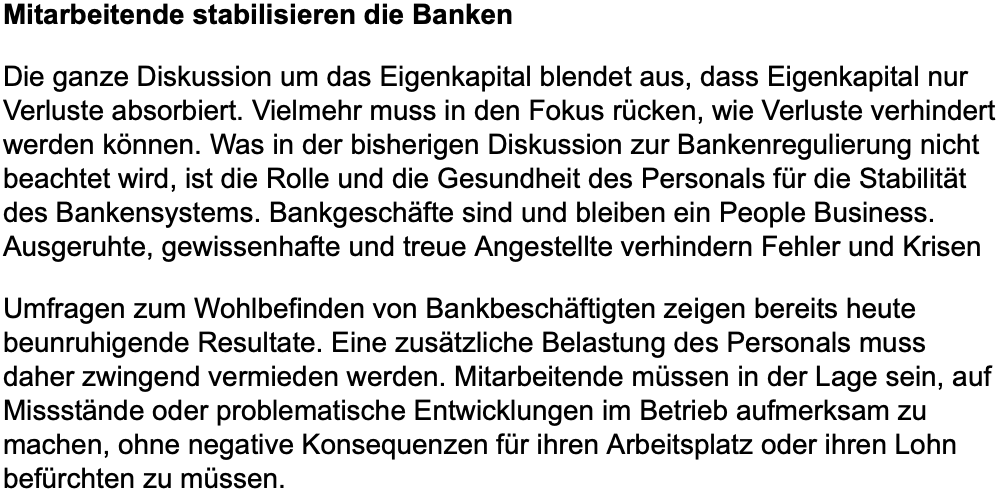 „Was in der bisherigen Diskussion zur Bankenregulierung nicht beachtet wird, ist die Rolle und die Gesundheit des Personals für die Stabilität des Bankensystems“, schrieb der Bank-Personalverband gestern zur Verschärfung des Bundesrats.