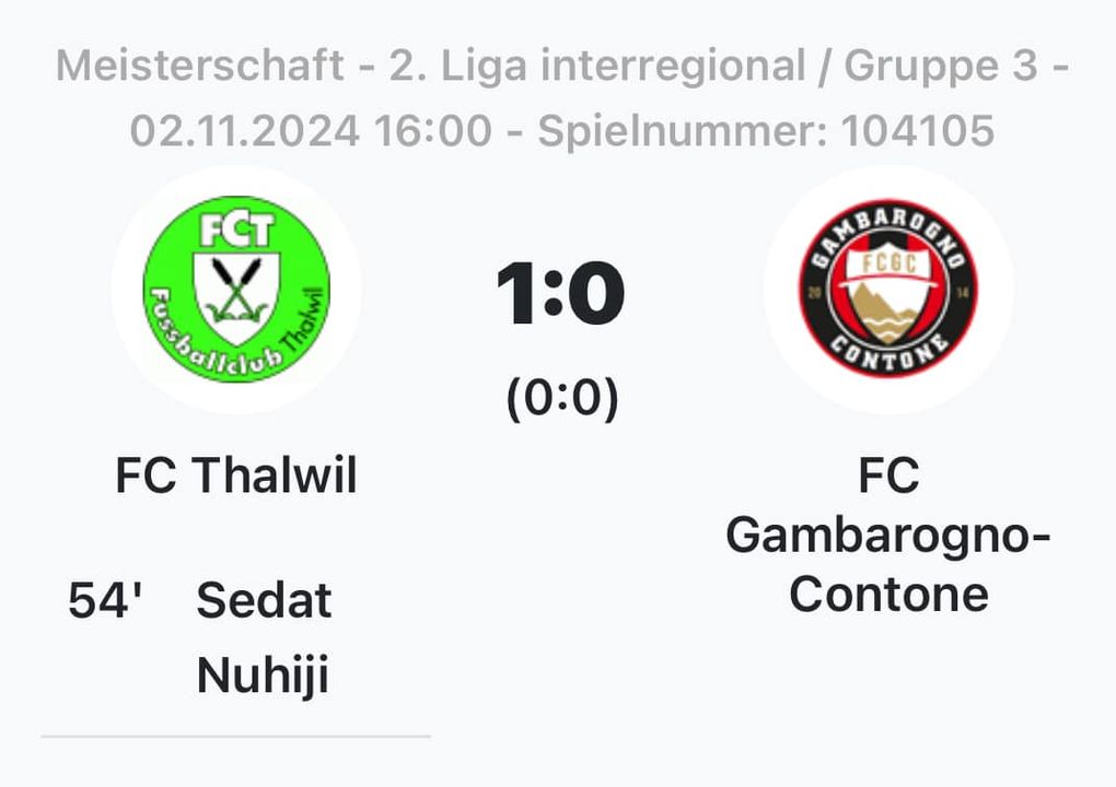 Kurz vor der Halbzeit, in der 37. Minute, erspielten sich die Thalwiler die gefährlichste Chance: eine schnelle Kombination, eingeleitet von Denis Haliti, führte zu einem Schuss im Strafraum, der jedoch geblockt wurde. Im direkten Gegenzug startete Gambarogno-Contone einen schnellen Konter, doch die Abwehr von Thalwil war hellwach und klärte mit einer entschlossenen Grätsche zur Ecke.
