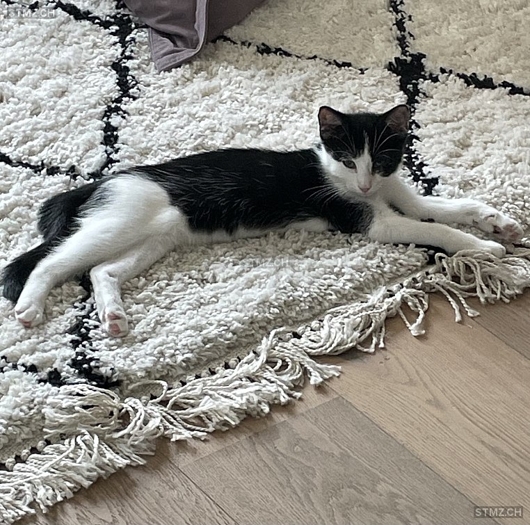 Das Fell um das linke Auge ist schwarz, das Fell um das rechte Auge ist weiss. Charly hat vier weisse Pfoten, einen weissen Bauch und einen schwarzen Rücken.