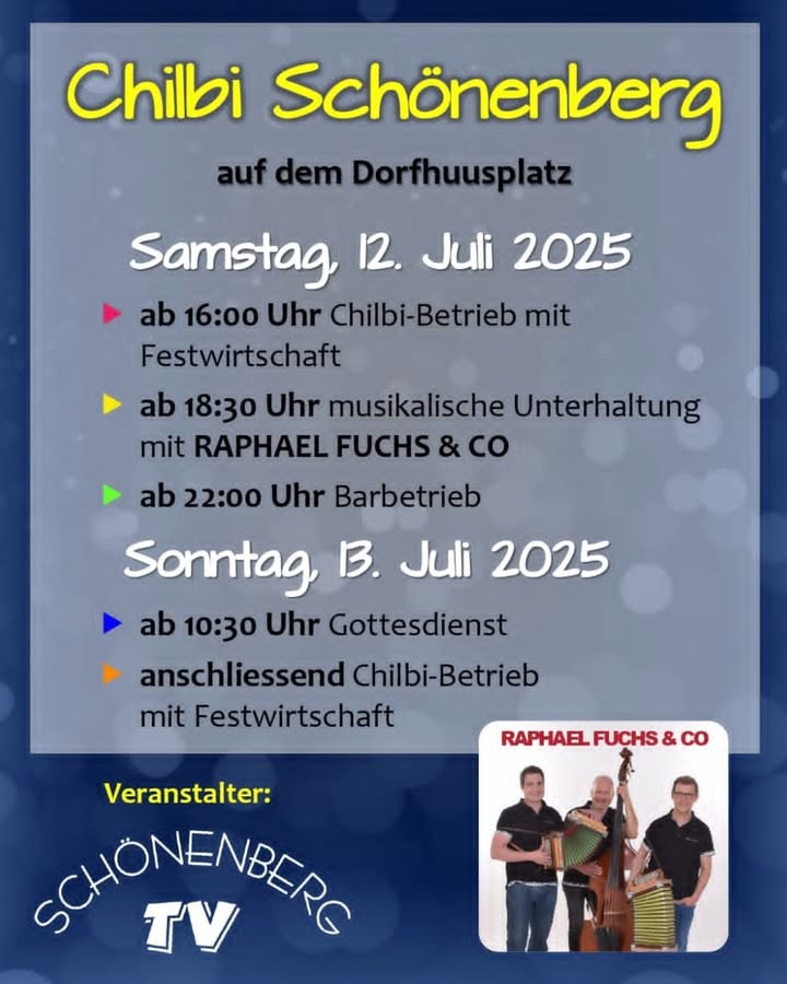 Heute Nachmittag geht die Chilbi Schönenberg los – und mit ihr zwei Tage voller guter Stimmung, Begegnungen und Dorfleben pur! Ob jung oder alt, ob für einen Schwatz, ein kühles Getränk oder einfach zum Geniessen – auf dem Dorfhuusplatz ist jede und jeder willkommen.