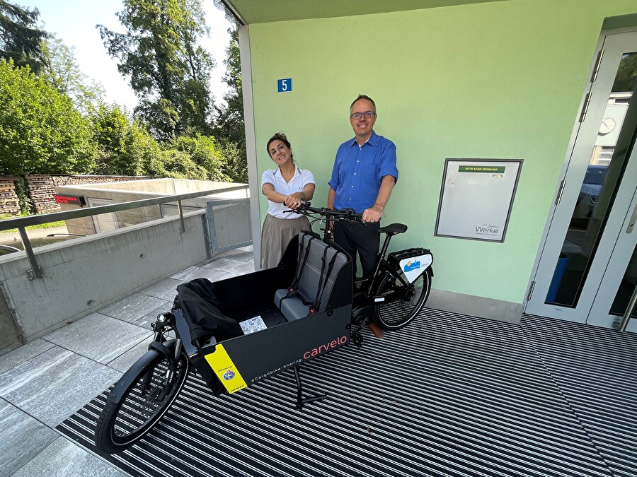 Bild: Stadtrat Jonas Erni mit Golrang Daneshgar, Leiterin Dienststelle Nachhaltigkeit gemeinsam mit dem neuen «Carvelo».