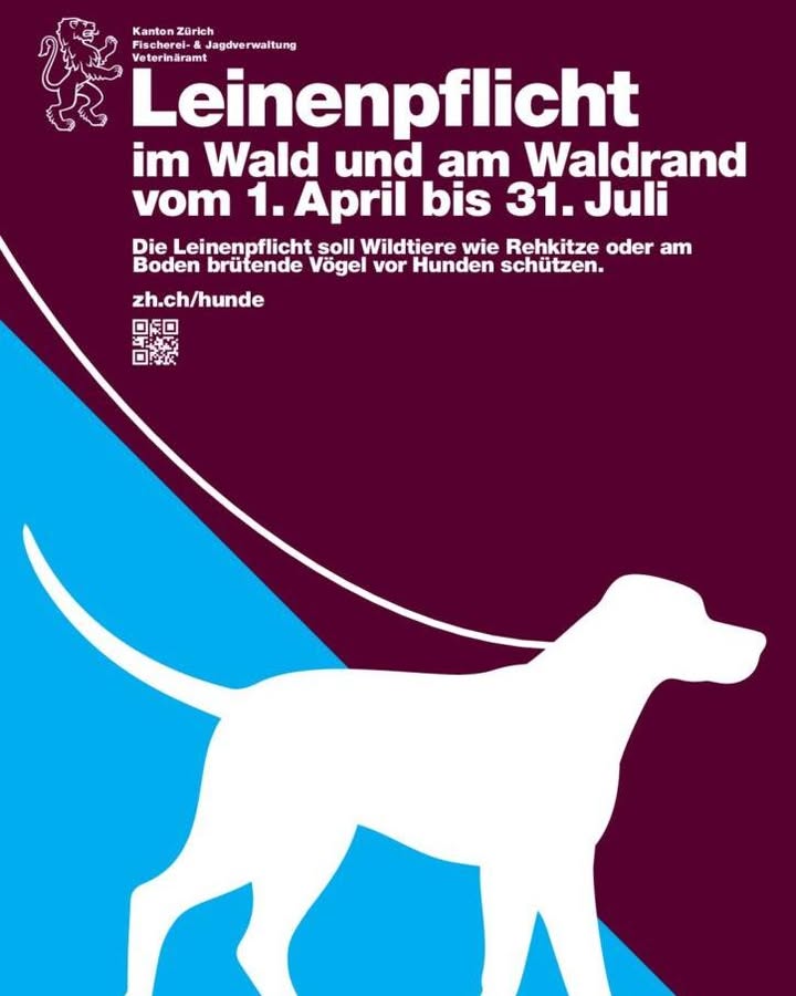 Von April bis Ende Juli gilt im Kanton Zürich wieder die Leinenpflicht für Hunde im Wald und am Waldrand 🌿🐾